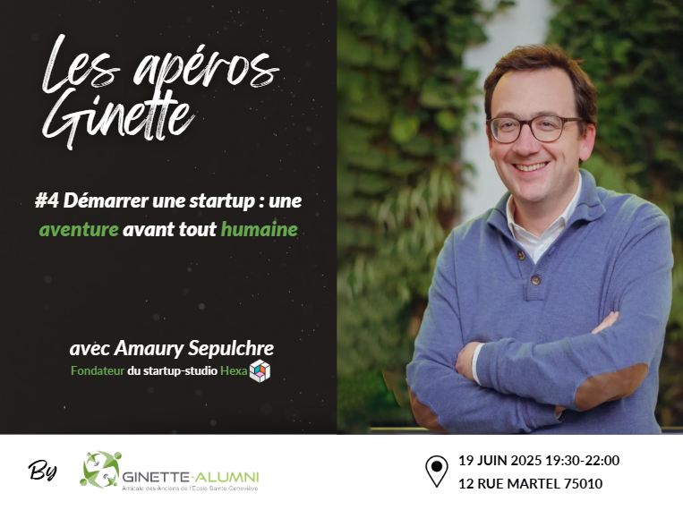 C'est le # 4 "Apéro Ginette" ! Un moment de rencontre et de partage transgénérationnel, convivial, avec l'intervention de Amaury SEPULCHRE ( BJ 96-98 ).Lire sa bio en bas Notre échange : - comment construire une équipe de fondateurs? - peut-on devenir entrepreneur? - quelques leçons apprises en ...