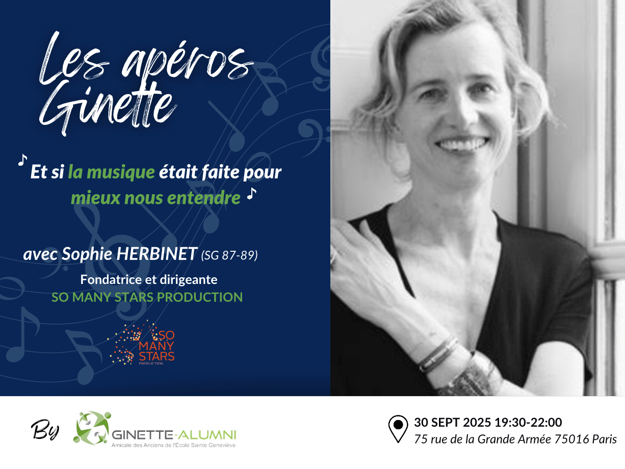 C'est le # 5 ! Un moment de rencontre et de partage transgénérationnel, convivial, avec l'intervention de Sophie HERBINET ( BJ 87-89).Lire sa bio en bas Fort de ses expériences, Sophie viendra nous éclairer et partager autour de : La musique, accélérateur de cohésion et catalyseur de ...